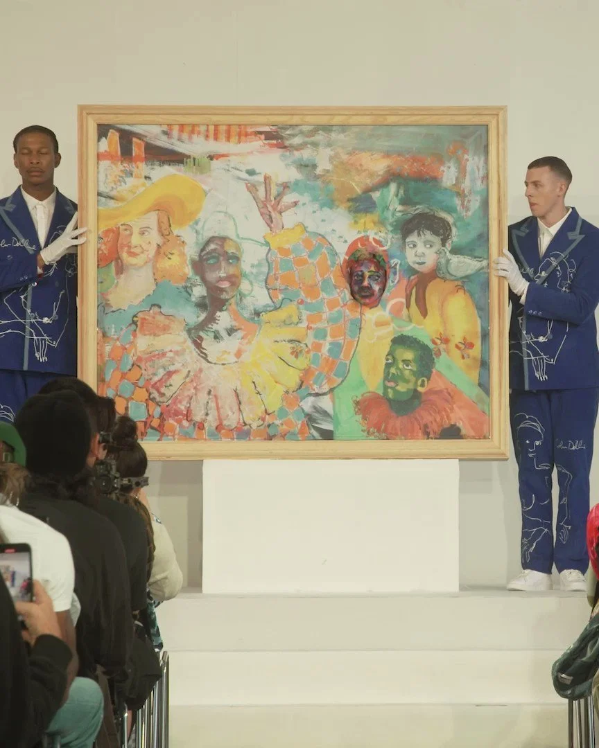 For Colm, textiles are more than mere materials; they are a means of self-expression. His innovative use of textiles transforms clothing into wearable art. By experimenting with unconventional fabrics, colors, and patterns, he challenges traditional norms and blurs the line between fashion and art. Textile work quite literally becomes a canvas! The show that conveys his unique perspective and personality is his SS23 runway where he creates an auction styled fashion show where he actioned off the paintings that inspired the clothing on the runway. As well as including a model into one the paintings by having a stretched canvas in a frame with a hole in the middle. This made it possible for the face of one of the models to poke through, then stepping out of the frame and directly on to the runway quite literally fusing fashion and art. His textile work is characterized by his relentless pursuit of experimentation. He constantly pushes the boundaries of traditional techniques, seeking new ways to manipulate fabrics and create captivating textures. Whether Dillane is hand-dyeing, screen printing, or embroidering, his attention to detail and commitment to craftsmanship result in textile designs that are visually striking and conceptually rich.