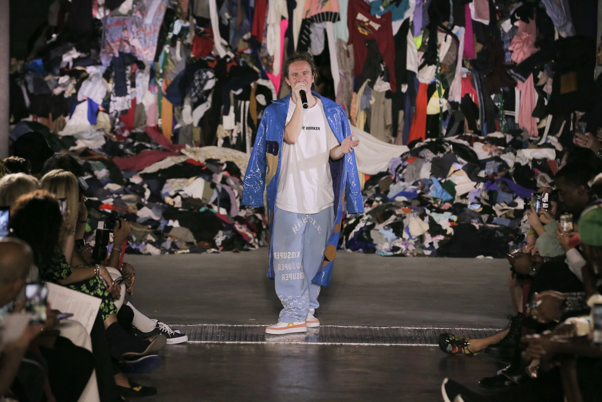 In an era where sustainability is at the forefront of the fashion industry, it is easy to over look it when the word sustainability is used so often. However, Colm helps KidSuper stands out for his commitment to eco-conscious practices. Recognizing the environmental impact of textile production, he employs sustainable materials and implements ethical sourcing methods. By using recycled fabrics and partnering with fair-trade organizations, KidSuper demonstrates that fashion can be both innovative and environmentally responsible. Unlike some sustainable brands, Colm does not let sustainability hold him back. He is still able to use his bright colors and patterns to converse with the audience about the importance of mixing art with fashion. Colm shook up the fashion industry with his recycled art installation and fashion show: “Assembly Line”. He got to show off his definition of recycled fashion. Using his platform to not only showcase his wonderful zero waste designs, but to create an interactive assembly line for attendees to dig through heaps of clothes to create their own one-of-a-kind piece takes the focus off the runway and leans into the concept for that collection: demonstrating the importance of sustainable fashion and circular design practices.
