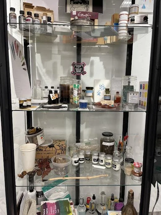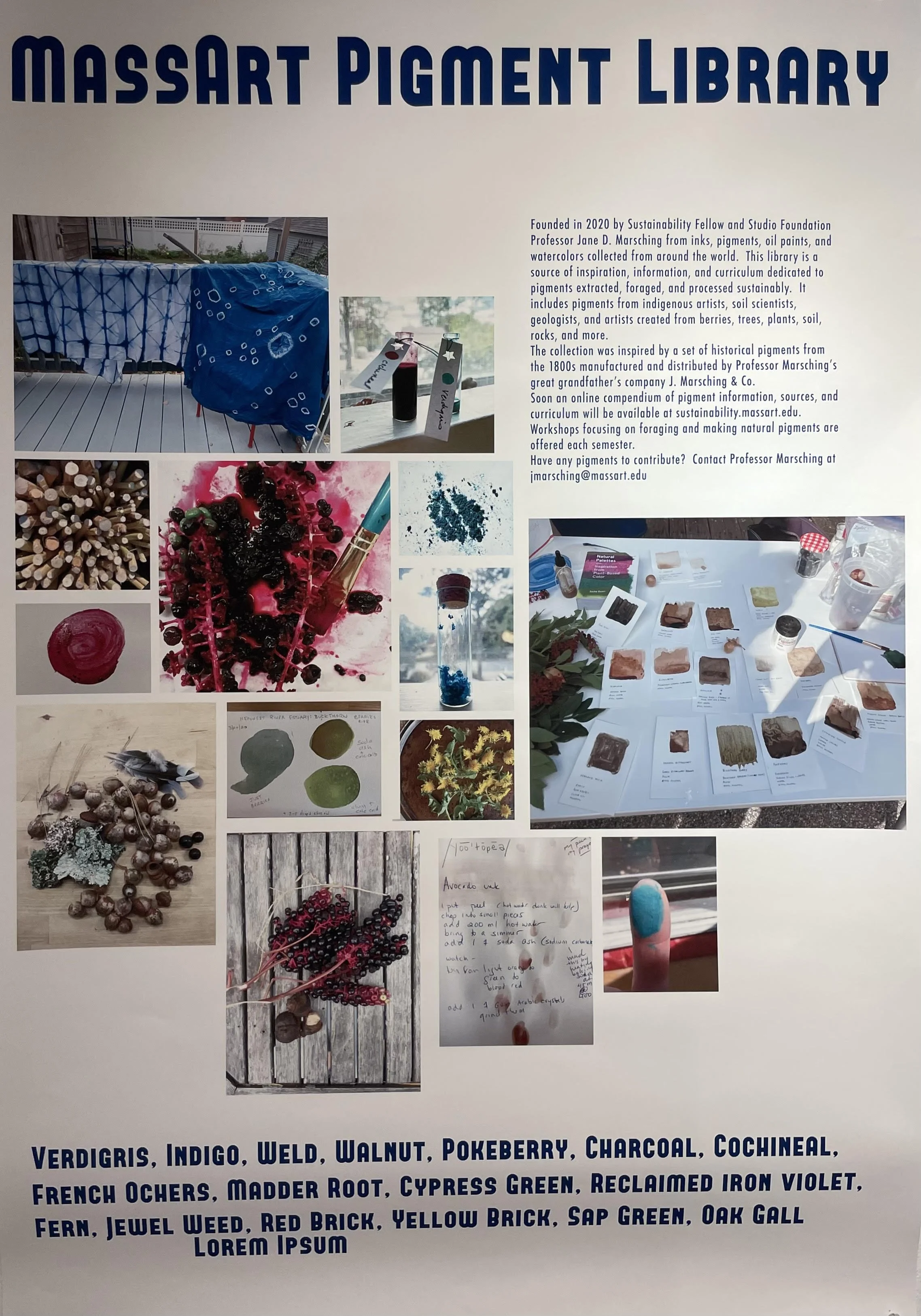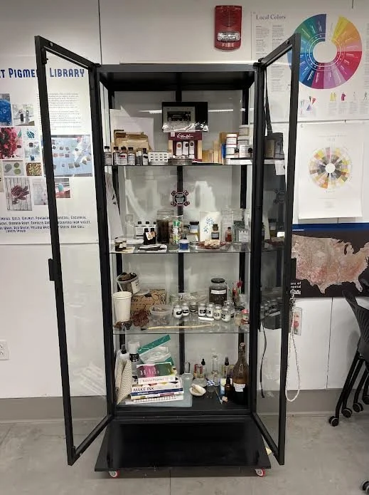 MassArt's Resilient Pigment Library was founded in 2020 by Professor Jane D. Marsching.This library has natural materials that make rich colorful ink, pigments, oil paints, and watercolors. Some of the more common items in the library are Indigo, walnut, charcoal, and ochre. The library is continuously growing by people submitting experiments playing with natural resources to get luscious pigments. Resources are all around us, you just have to be creative and look for them.