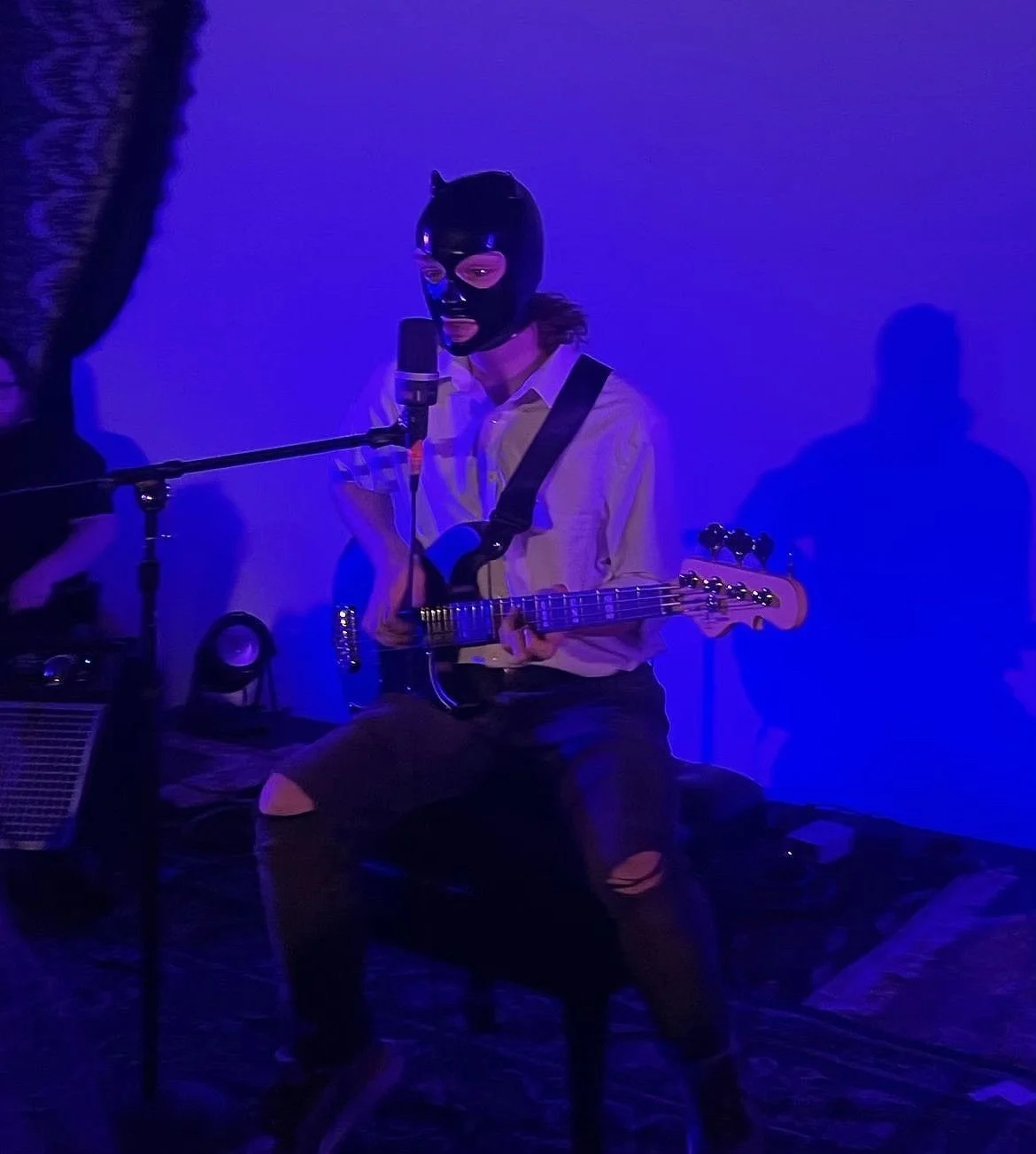 This theme of veiled vulnerability continued with a performance from Super Conducting Super Collider who sang a cover of Joni Mitchell's "All I Want" while illuminated in blue light, cleverly done as a reference to the album "All I Want" belongs to - “Blue” I am used to seeing Super Conducting Super Collider vivaciously playing the sax (and a litany of other instruments) in the company of their band Roaches All The Way Up. For Red Light District, they took a much more subdued approach to their solo performance. Their face covered in a black latex mask, Super Conducting Super Collider softly strummed their guitar as flashlights slowly rose from the crowd and swayed to the song. Playing to a room of mostly Gen-Z students, a generation characterized by their interconnectivity but lack of intimacy, Mitchell's lyrics, "looking for something, what can it be?/Oh, I hate you some, I hate you some, I love you some/Oh, I love you when I forget about me," certainly resonated. Super Conducting Super Collider spoke directly to the ethos of the event when they sang, "Do you see, do you see, do you see how you hurt me, baby?/So I hurt you too/Then we both get so blue." In the Red Light District, the lines are blurred between pain or pleasure, sex or love, and domination or submission. Somehow, they all seem to coexist in the land of leather and latex.