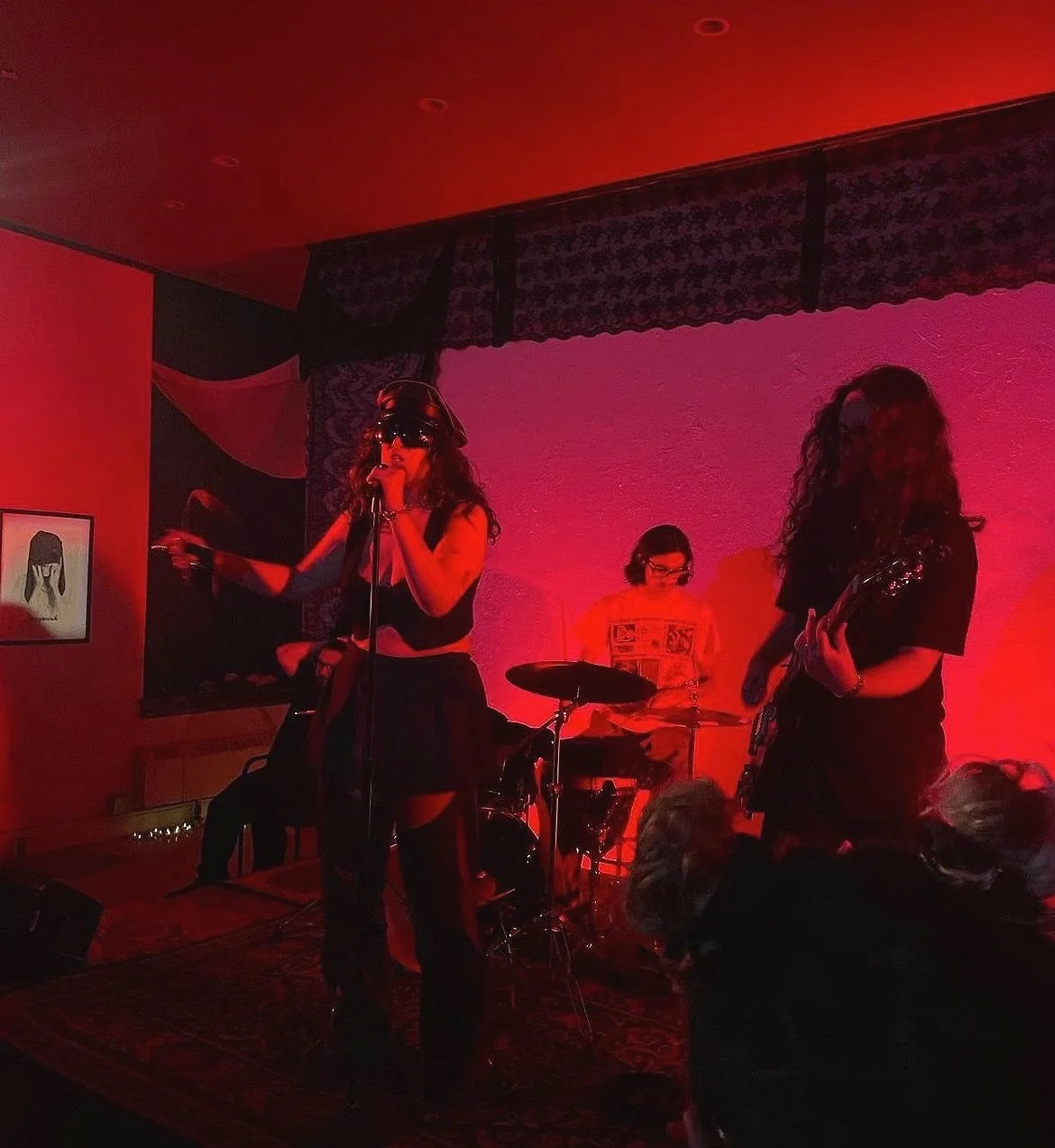 The evening began with a sultry yet melancholic rendition of The Deftones' "Change (In the House of Flies)'' sung by Veronica. "I took you home/Set you on the glass/I pulled off your wings/Then I laughed," Veronica sang, her face barely visible beneath large black shades and a leather conductor's hat. "Change (In the House of Flies)" paints a picture of a relationship gone awry. The admiration the narrator feels for the object of their desire becomes so unbearable that they want to dehumanize, devour, and contain this person. The Deftones make degradation and yearning sound super sexy and so does Veronica. Later that night, barefoot in the courtyard and clearly worn out from her dual role as both a performer and producer, Veronica revealed to me that it was her first-ever performance as a singer. Her brilliance on stage would suggest she’s a seasoned performer.